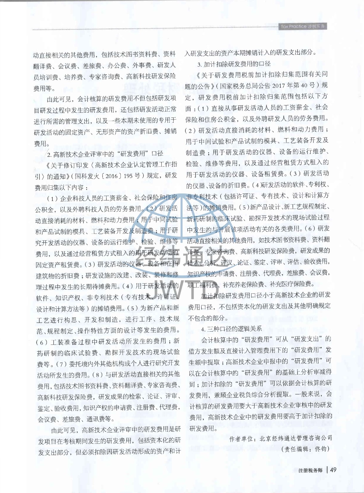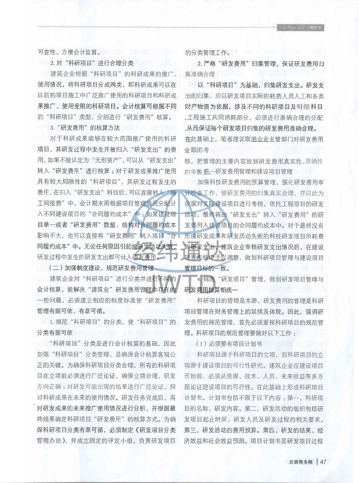 经纬通达的研究作品《规范建筑企业研发费用会计核算的思考》已发表于由国家税务总局主管、中国注册税务师协会主办的期刊《注册税务师》(2023年 第11期)。