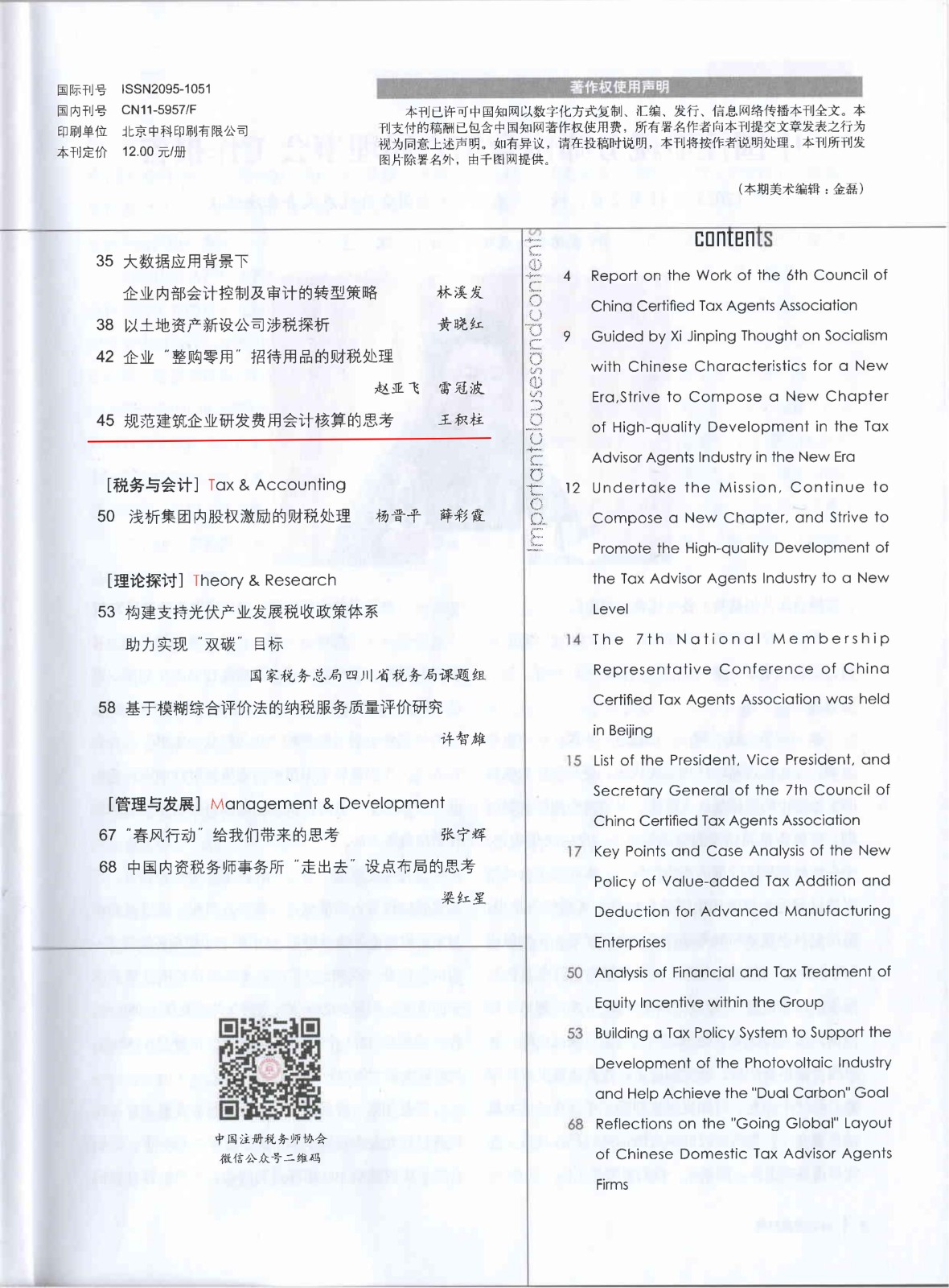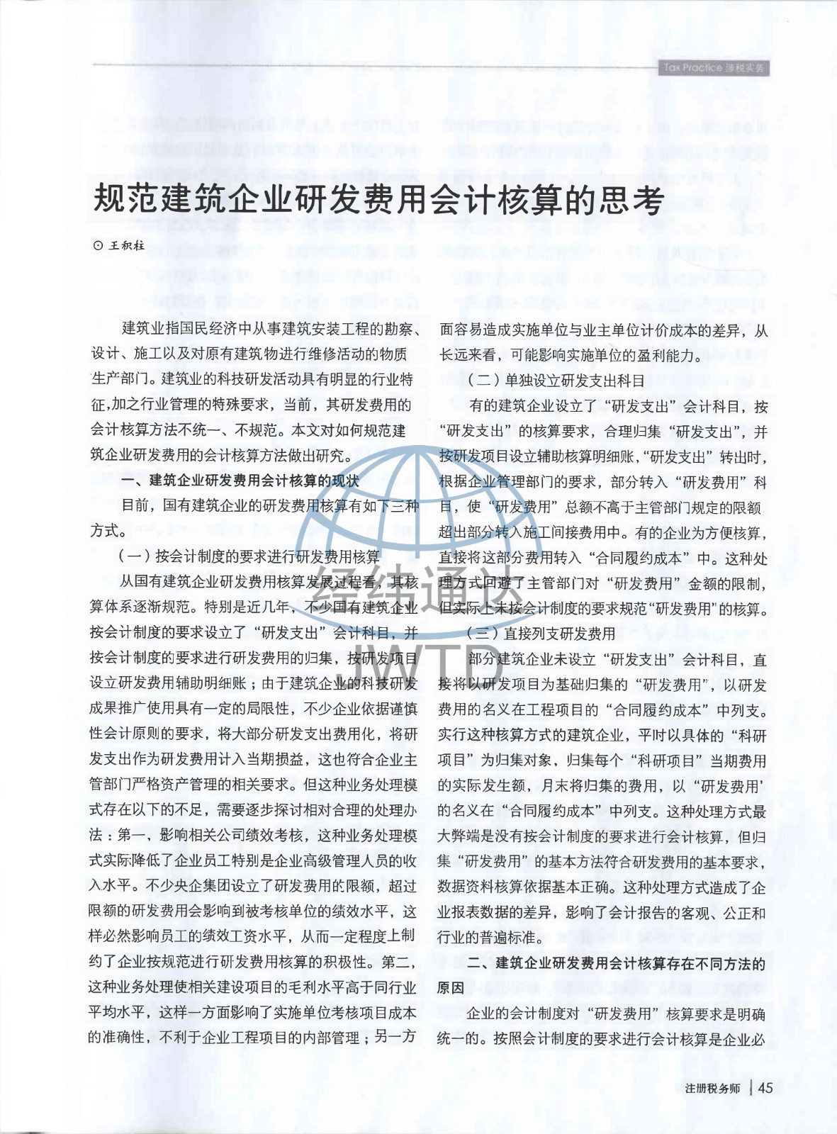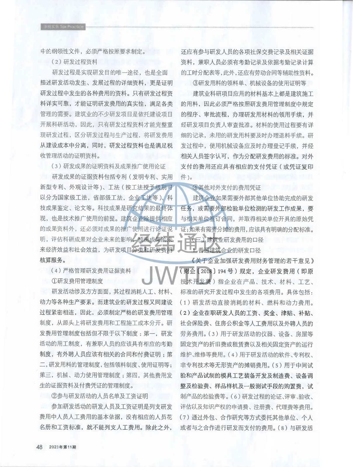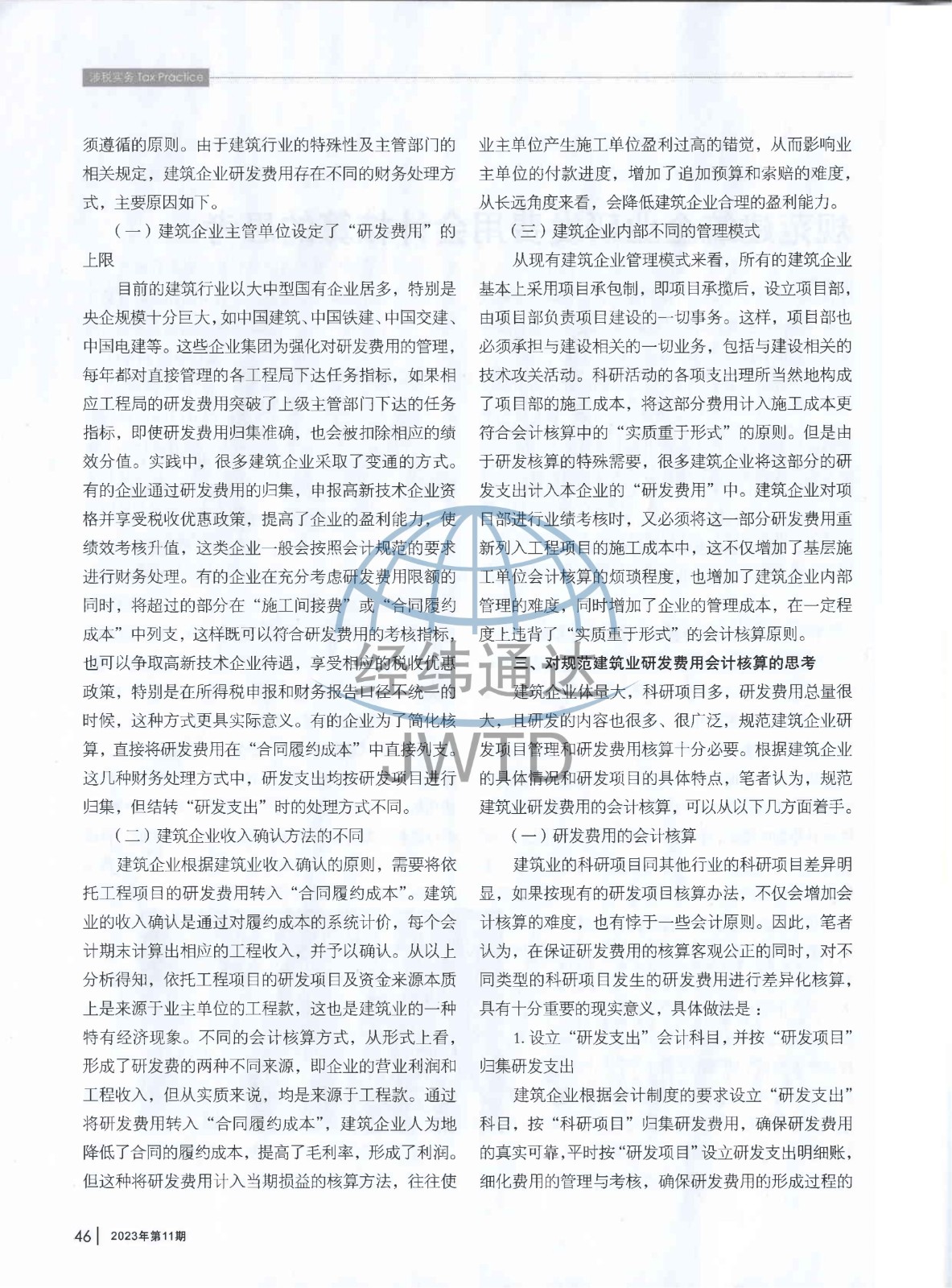 经纬通达的研究作品《规范建筑企业研发费用会计核算的思考》已发表于由国家税务总局主管、中国注册税务师协会主办的期刊《注册税务师》(2023年 第11期)。